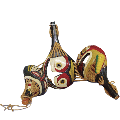 鎮宅面具(jù)。木(mù)雕彩繪,狀如虎頭, 分(fēn)成三段, 象征身體(tǐ)的頭部、上 身、下體(tǐ),有(yǒu)男身、女身之别。用(yòng)麻 繩連接,一般懸挂于房門、屋内牆 上。木(mù)瓢吞口源于彜族虎崇拜、生 殖崇拜文(wén)化,當地人相信懸挂此物(wù) 能(néng)吞食妖魔,鎮宅守家,人丁興旺。
